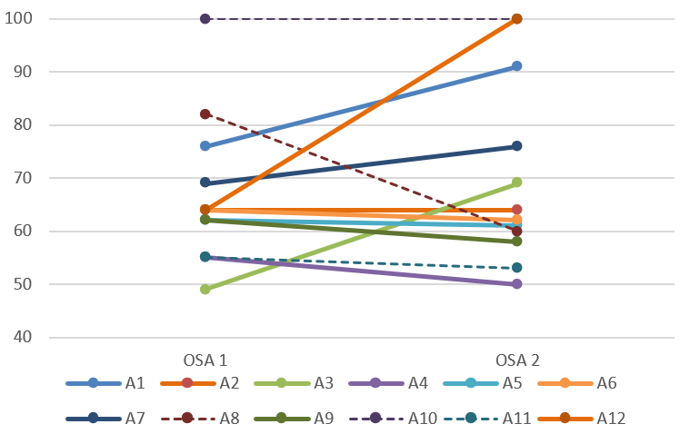Among all participants who did the modules (n=12), 3 completed the pre- and post-tests within less than two days. Of those whose OSA tests were two or more days apart, there were 7 whose scores essentially did not change (a change of 7 or less) and 2 whose scores markedly improved, showing an increase of 20 points for one participant and 36 points for another. The results are depicted in Figure 1, which shows the change in OSA scores for each individual.