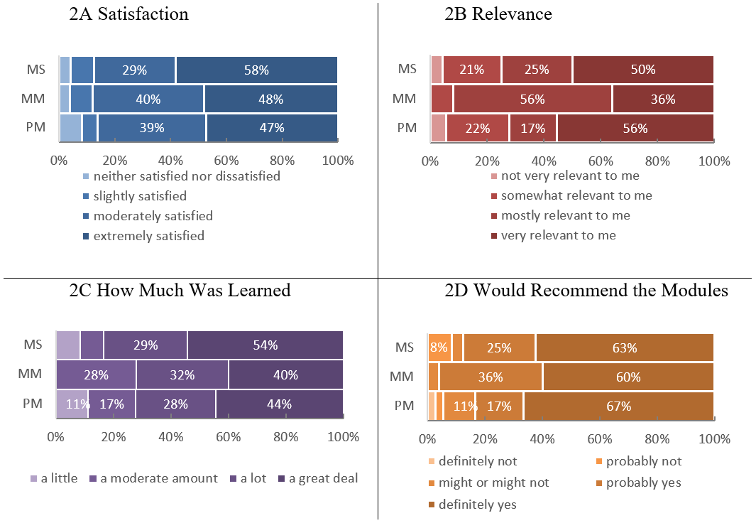 The module satisfaction surveys were anonymous and collected data about module completion and satisfaction. All respondents indicated that they completed at least some of the module content, and the majority of respondents said that they completed all or most of the module content, as shown in Table 2.